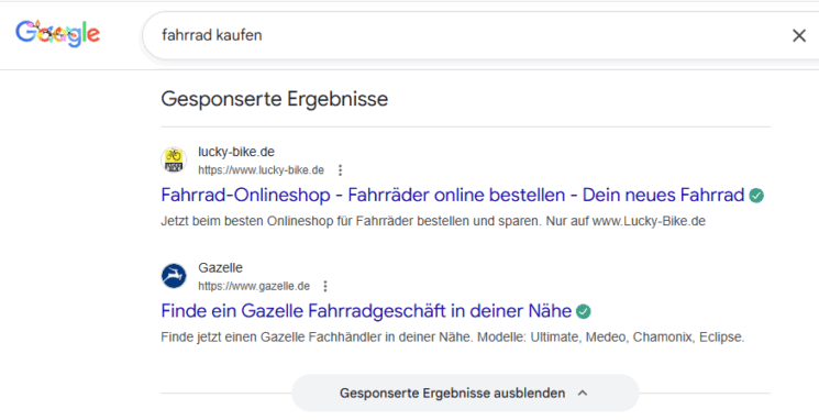 Wenig später stellte Google die Anzeigendarstellung in den SERPs um. Es wird nicht mehr jede Anzeige einzeln als Werbung deklariert, vielmehr erfolgt die Kennzeichnung blockweise, um laut Google die Darstellung zu vereinfachen. Außerdem besteht die Möglichkeit, die Anzeigen zusammenzuklappen. Standardmäßig sind die Ergebnisse allerdings ausgeklappt, was teilweise einen beträchtlichen Teil des Bildschirms einnimmt.