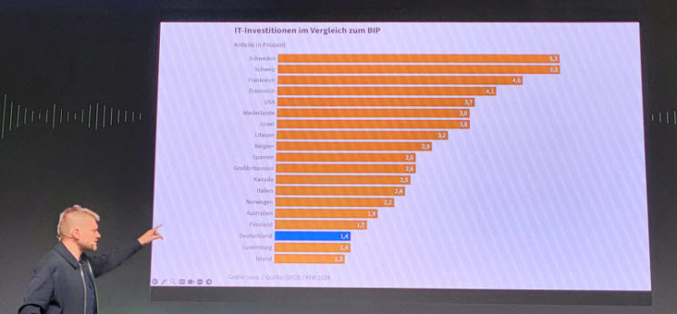 IT-Investitionen im Vergleich zum BIP (Bruttoinlandsprodukt): Deutschland befindet sich in der gezeigten Auswertung auf dem drittletzten Platz. Darunter sind nur noch Luxemburg und Island, die beide zusammen weniger Einwohner als Hannover zählen. (Grafik: saco. / Quelle: OECD / KfW 2024)