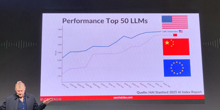 Aus dem HAI Stanford 2025 AI Index Report geht hervor, dass es kein Top 50 Performance LLM aus Europa gibt. Manche Zuschauer hatten noch darauf gewartet, dass der 3. Graph eingeblendet wird, dies passierte jedoch aus diesem Grund leider nicht.