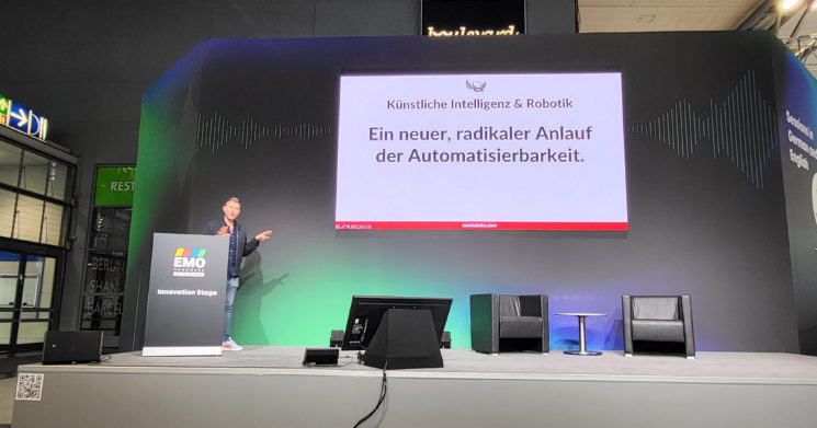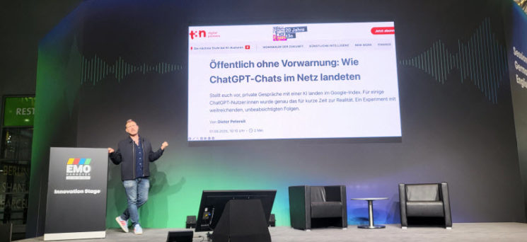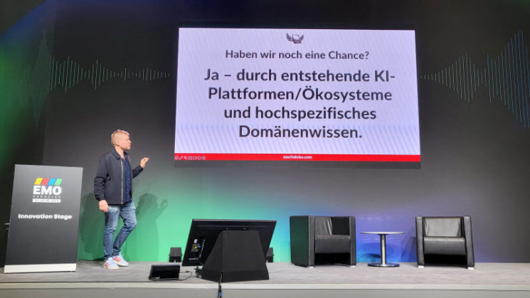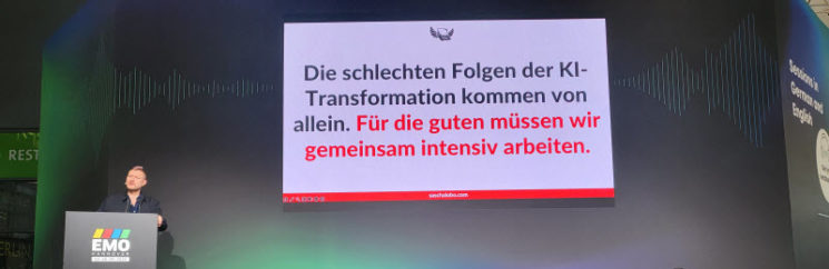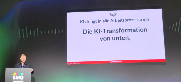 Besonders interessant, da auch u. a. den Einsatz generativer KI aufgreifend, war der Vortrag von Sascha Lobo, der auf dem zentralen EMO-Forum in Halle 12 stattfand. Der Speaker mit dem Irokesenschnitt ist seit über 10 Jahren bekannt als Publizist und Digitaldenker.