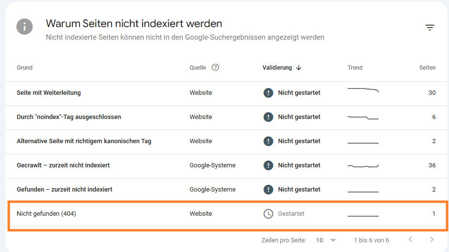 - Dort finden Sie unter „Warum Seiten nicht indexiert werden“ eine Auflistung Ihrer derzeit nicht indexierten Seiten.