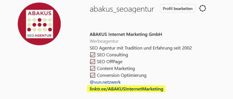 - Link: Im Hinblick auf SEO OffPage der wichtigste Bestandteil des Instagram Profils. Der Link sollte möglich kurz sein, da er sonst weniger verbraucherfreundlich ist und die Klickrate sinken lässt. Im Internet gibt es viele kostenlose Anwendungen, mit denen sich der Link auf eine angemessene Länge kürzen lässt.